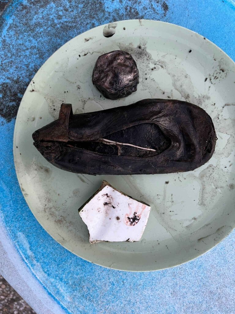 … een kinderschoen, een scherf afkomstig van het ziekenhuis en een loden dop van een fles melk van coöperatie De Landbouw Leiden.