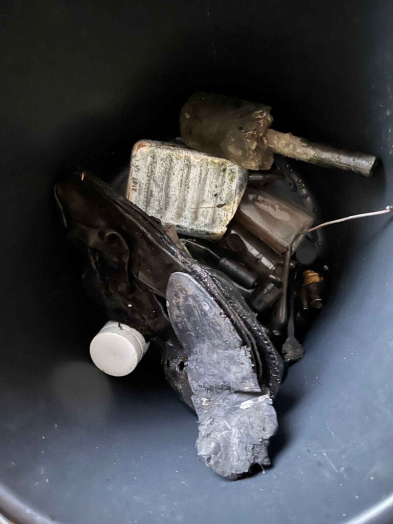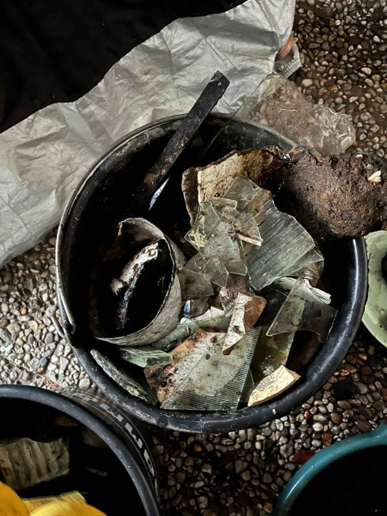 Een emmer vol scherven en allerlei laboratorium-gerelateerd materiaal…